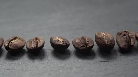 Coffee beans lie in row on stone. The camera slowly fly left over coffee
