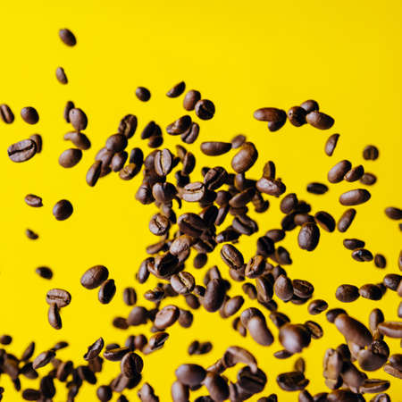 Flying coffee beans on a dark background. Roasted coffee beans flying in the air.