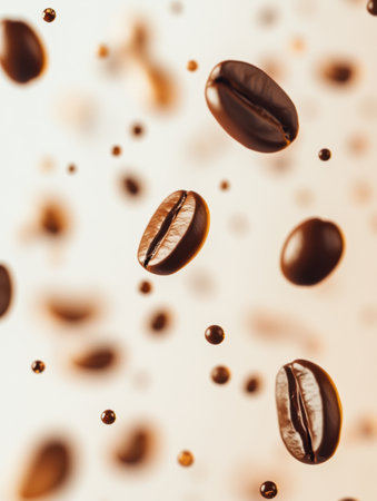 Floating coffee beans create a dynamic visual effect against a plain background in an artistic showcase of coffee culture