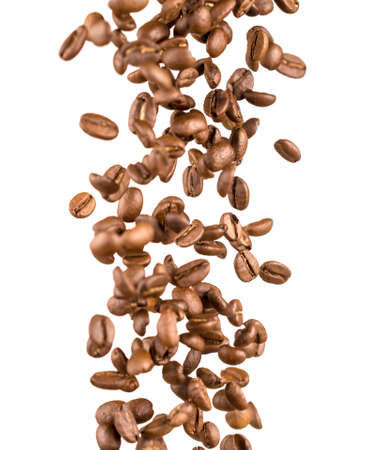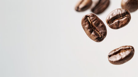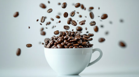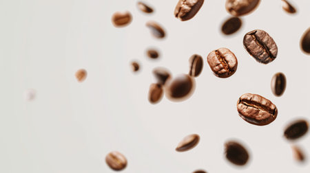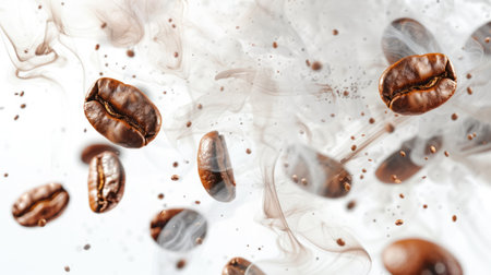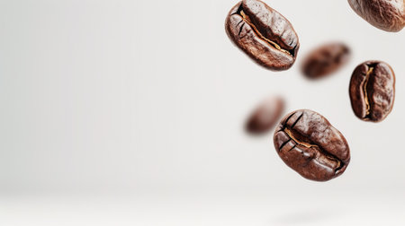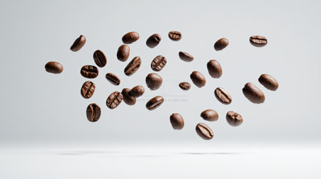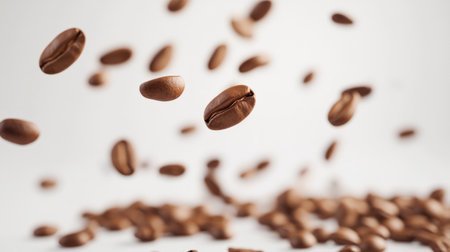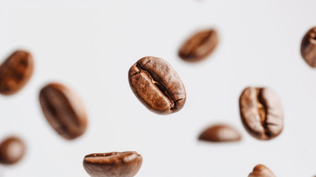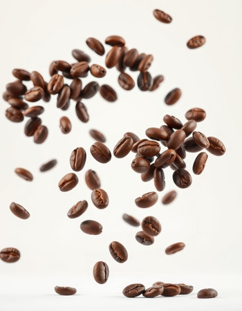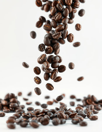 Roasted coffee beans levitating against a clean white background, creating a dynamic and energetic scene ideal for coffee related projects and designs