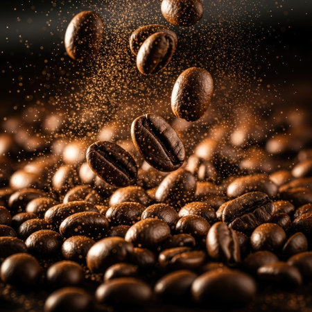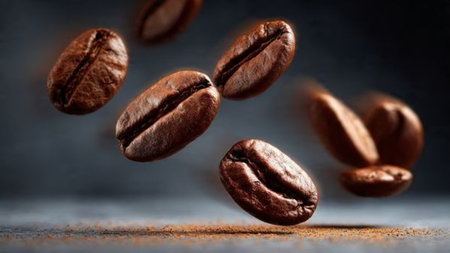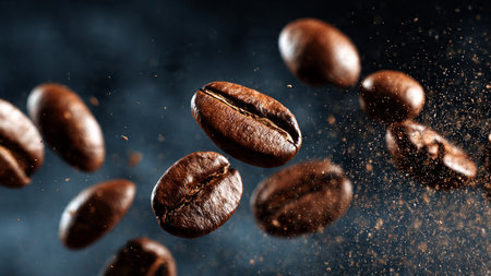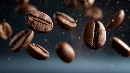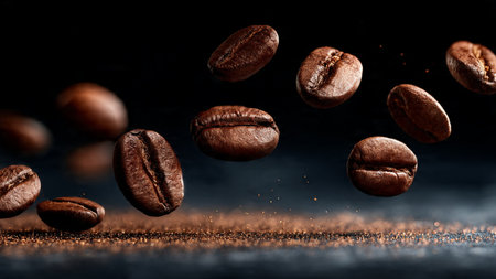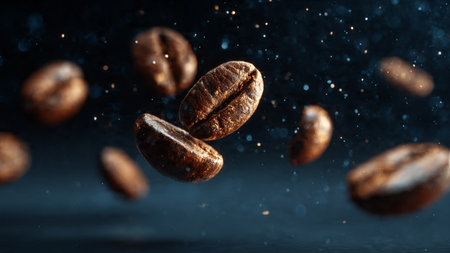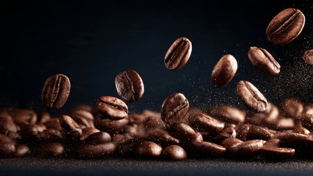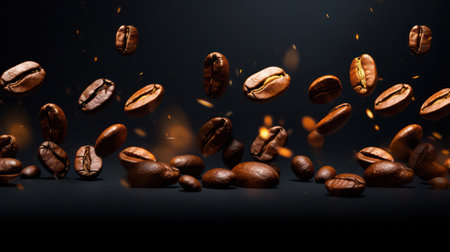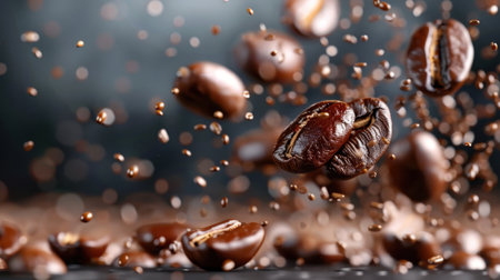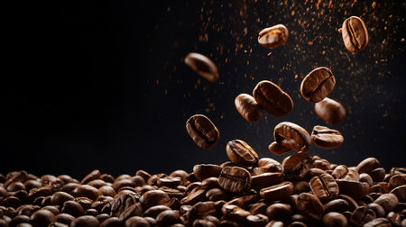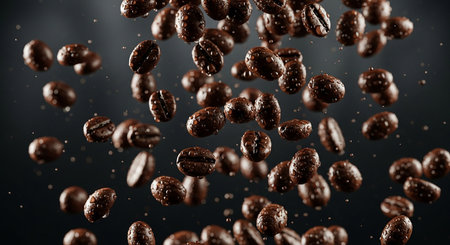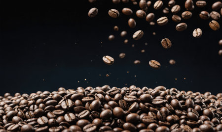 Roasted coffee beans mid-air, glistening and cascading, illuminated against a dark, dramatic backdrop, capturing the essence of a fresh brew