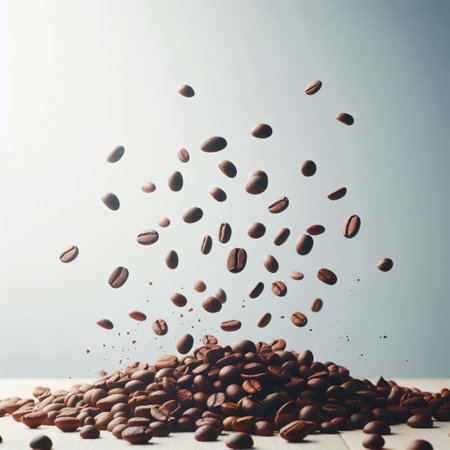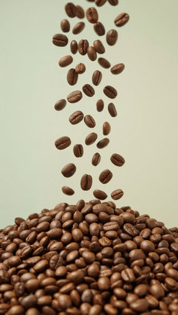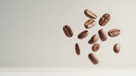 Roasted coffee beans levitating on a minimalist background creating a dynamic and energetic composition, ideal for advertising or promoting coffee products