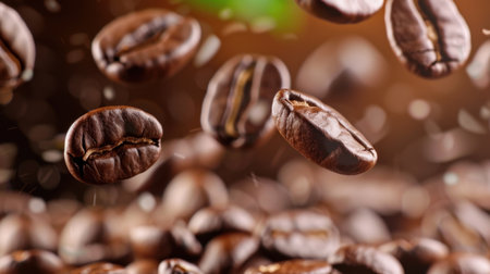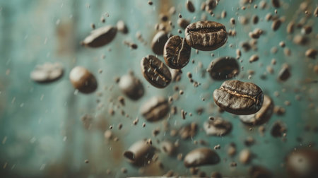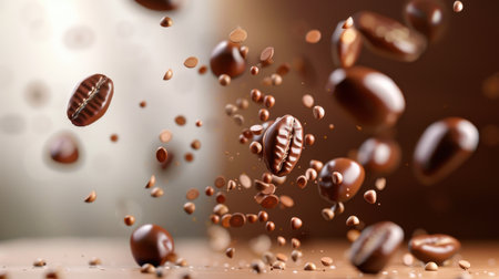 A stunning image showcasing flying coffee beans captured in mid-air against a blurred background, emphasizing their rich color and texture, perfect for coffee enthusiasts.
