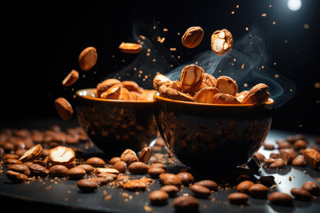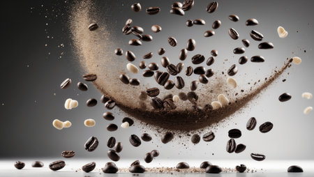 AI Generated. Coffee Beans in Motion with Coffee Powder Splash