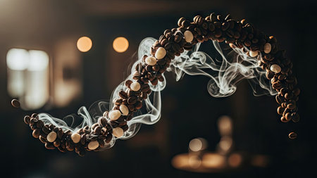 A close-up shot presents an artistic arrangement of coffee beans suspended in the air. The brown and beige beans are interwoven with wisps of smoke, creating a dynamic visual. The dark backdrop enhances the contrast, while the overhead lighting adds depth, suggesting a studio environment, perfect for promotional material.