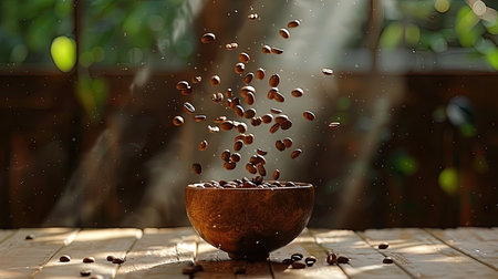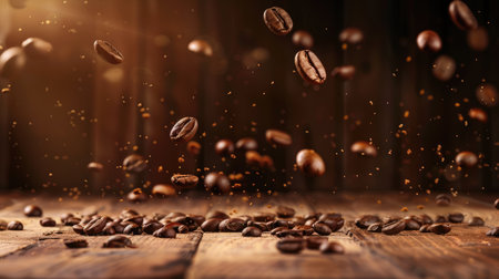 A captivating image showcasing brown coffee beans falling gracefully against a rustic wooden background, enhanced by a dreamy bokeh effect, perfect for coffee-themed designs.