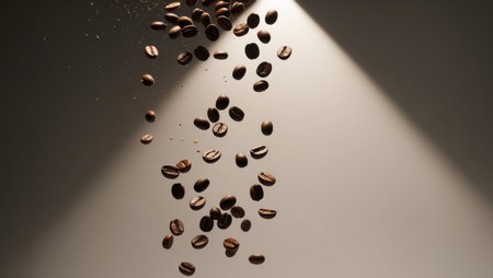 Coffee Beans Descending with Dramatic Lighting on Dark Surface