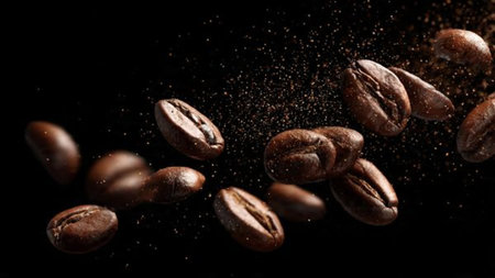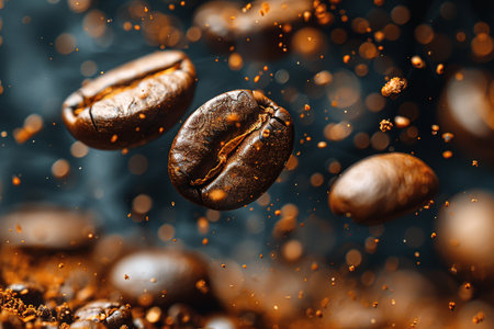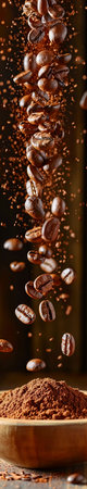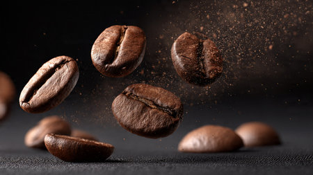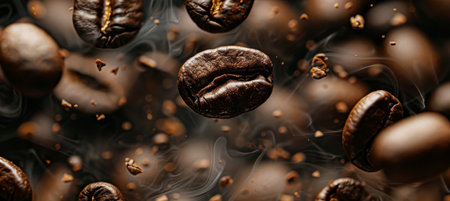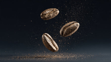 Captivating image of coffee beans floating mid-air, surrounded by fine brown particles. The dark background enhances the rich essence of coffee culture.