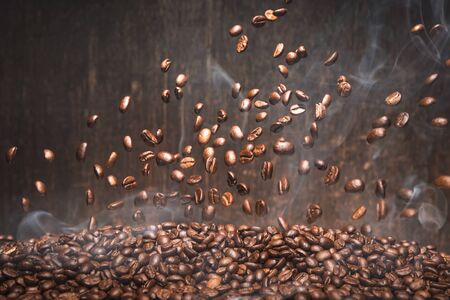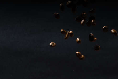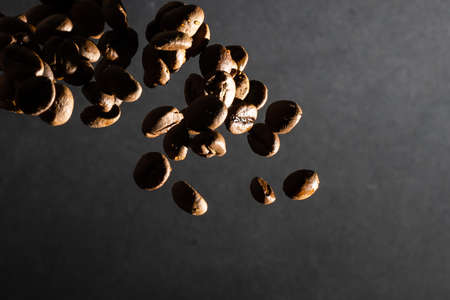 Brown roasted coffee beans falling on pile.Represent breakfast, energy, freshness or great aroma,Flying on stack of seed and dark background with copy space, close-up