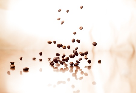 Ai generative image. Coffee beans falling from top to bottom. light brown background