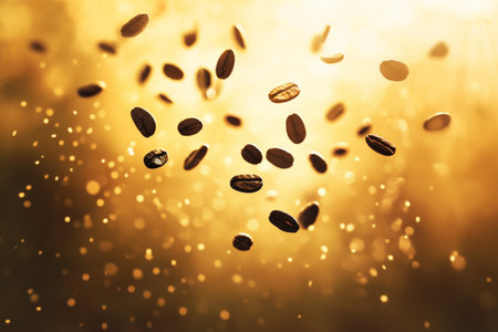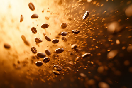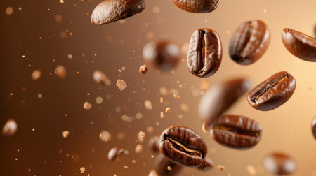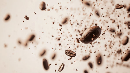 A captivating close-up of coffee beans floating in mid-air against a soft, warm background, with delicate dust particles enhancing the dynamic motion.