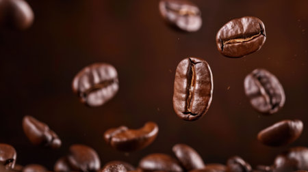 This captivating image features flying coffee beans against a rich brown background, capturing the essence of freshness and dynamic energy in every frame.