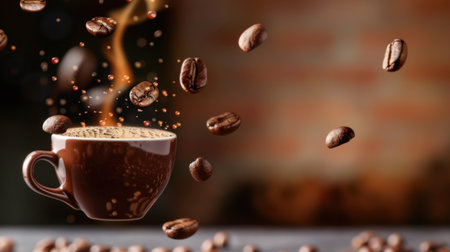 A steaming cup of coffee sits elegantly amidst flying coffee beans, capturing the essence of a cozy and inviting coffee moment. Ideal for beverage themes.