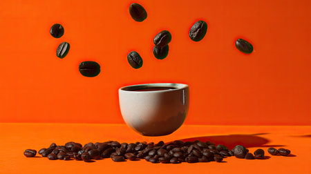 A captivating still life featuring coffee beans floating above a cup on a bright orange backdrop. Ideal for showcasing food and beverage themes.