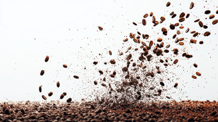 Dynamic capture of flying coffee beans emphasizing freshness and energy in a striking white background. Perfect image for coffee lovers and culinary enthusiasts.