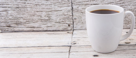 Top view of a brown hot coffee cup on an old wood table vintage style with light nature