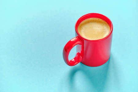 White cup with black coffee on a blue background. Morning breakfast.Empty space for the text. Minimalistic photography.