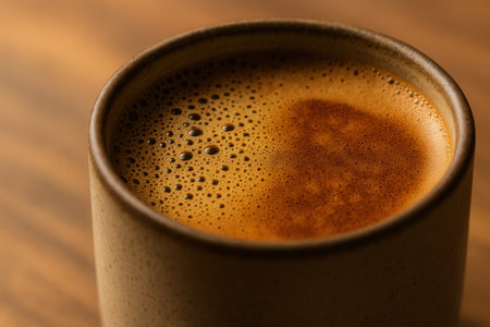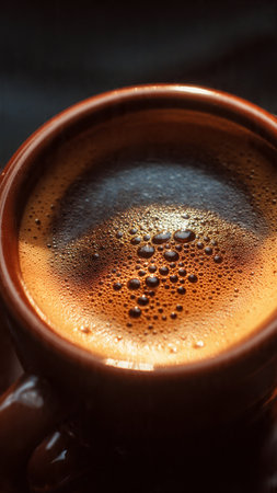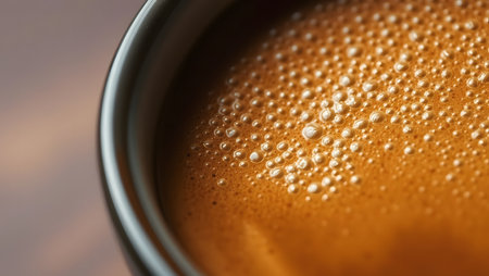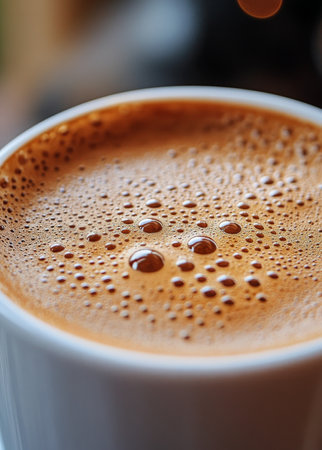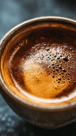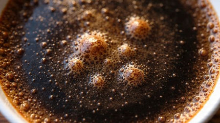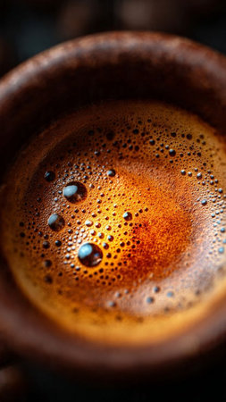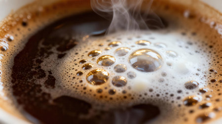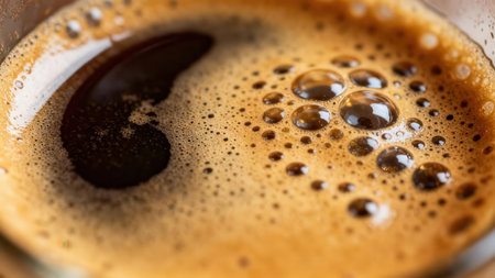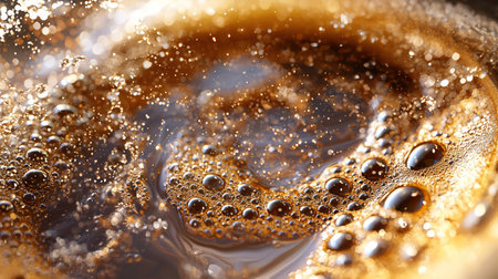 The scene captures a close-up view of freshly brewed coffee emphasizing the rich crema and bubbles forming on the surface. The contrast of colors highlights the texture and depth of flavor.