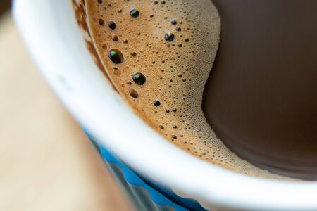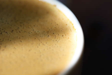 Thick coffee crema, Americano. Bubble brown foam. Soft focus background. Strong Italian drink