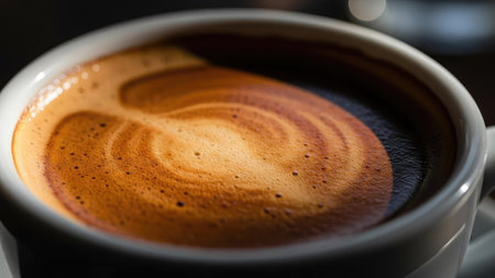 This close-up image showcases a white ceramic cup filled with rich, dark espresso. The coffee is topped with a meticulously crafted foam design, featuring swirling patterns. The composition employs soft, warm lighting that highlights the textures. Suitable for commercial and editorial applications, this image evokes a sense of freshness and enjoyment.