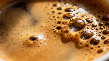 Detailed macro view of fresh espresso coffee with rich, textured crema and bubbles.