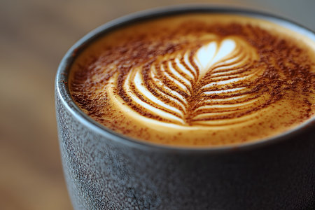Steaming cappuccino with frothy whimsy, evoking cozy autumn mornings, International Coffee Day celebrated with artistic crema patterns