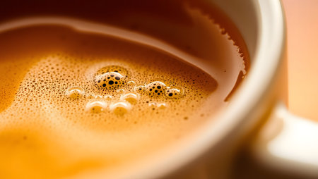 Detailed macro shot of foamy, golden-brown crema on a fresh cup of coffee.