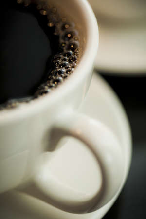 Close-up of white cup with fresh hot black coffee with bubbles on the surface in natural sunlight