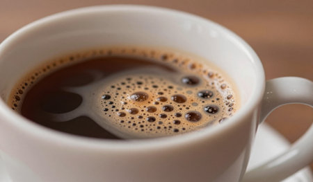 A white cup filled with dark coffee sits on a wooden table. The coffee has foam and bubbles showing its freshness. This scene is set in a cafe during the morning hours.