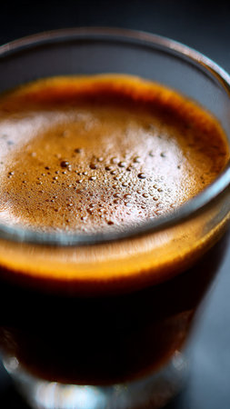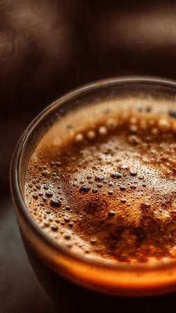 Captivating top-down view of a coffee beverage in a glass. The coffee is freshly brewed, with a rich dark brown color and an abundance of frothy bubbles.