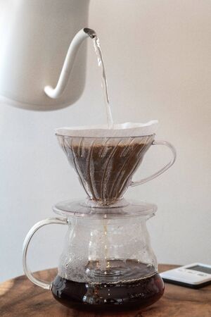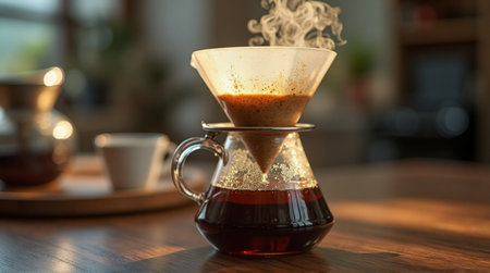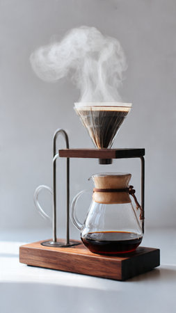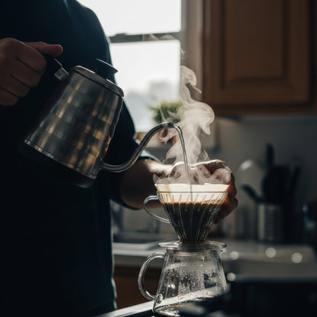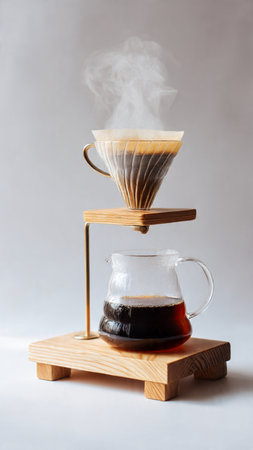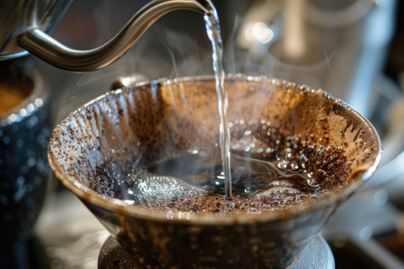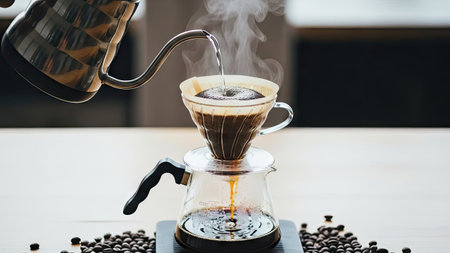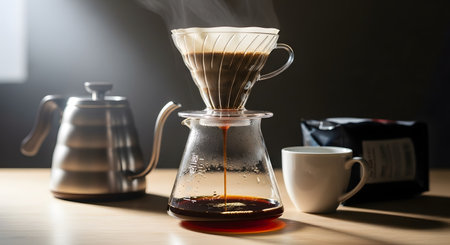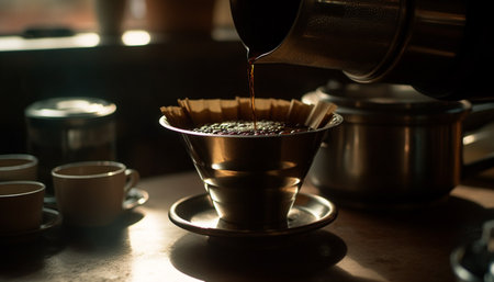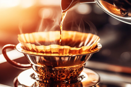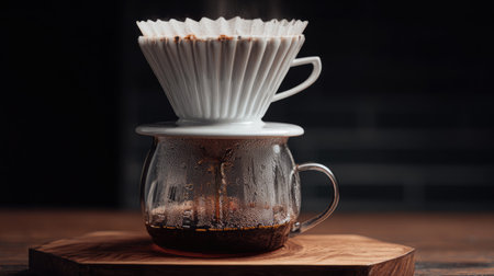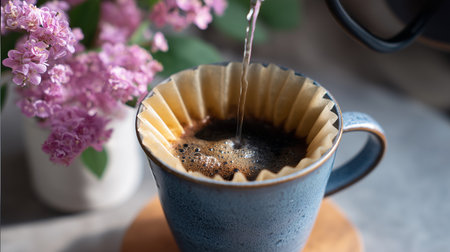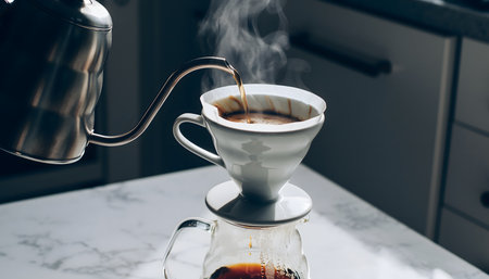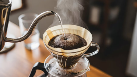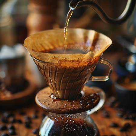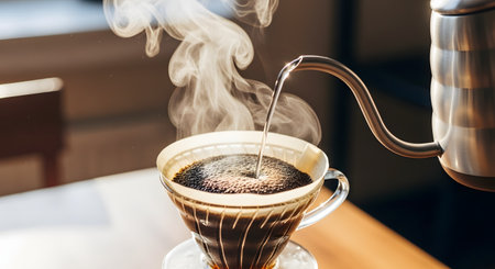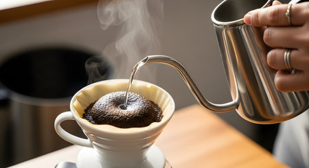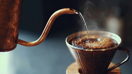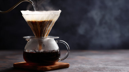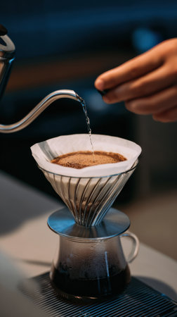 Freshly brewed coffee is prepared using the pour-over method. A hand gently pours hot water over ground coffee in a filter, creating rich aromas. This scene captures morning tranquility.