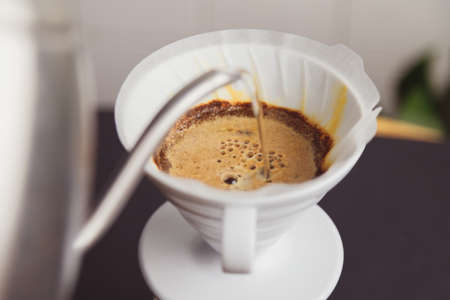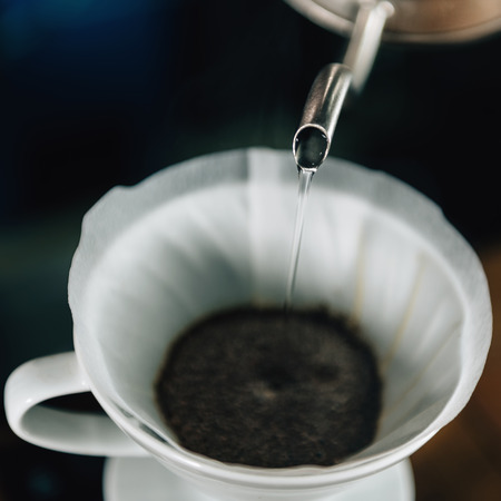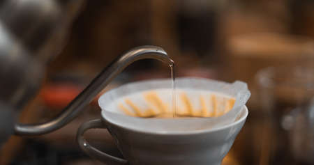 Coffee drip process by pouring hot water from kettle though ground berries bean with filter