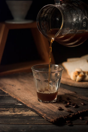 Alternative coffee brewing method,pure over,glass teapot on wooden tray with freshly brewed coffee on dark background. AI Generated
