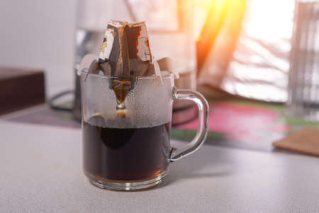 Drip fresh coffee sachets on the transparent glass coffee cup with dripped coffee inside.