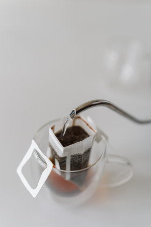 Boiling water pouring from kettle into drip coffee bag placed in glass cup, offering simple and convenient way to brew fresh cup of coffee, close-up. Concept of quick way to enjoy fresh cup of coffee.