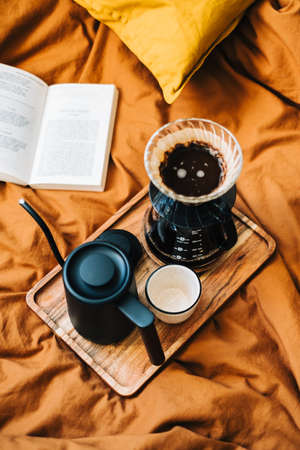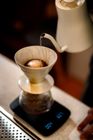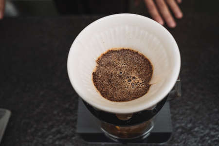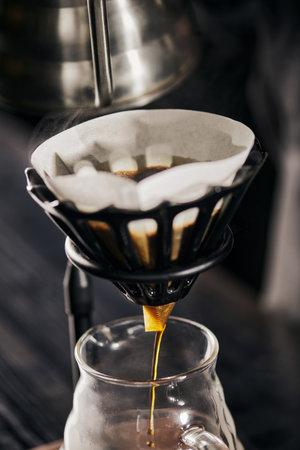 Coffee brewed by the pouring method. Alternative ways of brewing coffee. Coffee shop concept.