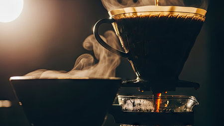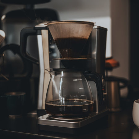 This image showcases an elegant coffee brewing setup featuring a filter and glass carafe. The warm ambient lighting enhances the brewing process, offering a cozy and inviting atmosphere. Perfect for coffee lovers and home baristas seeking inspiration for their morning routine.