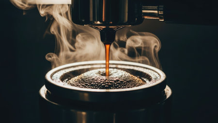 Close-up of espresso pouring from coffee machine. Professional coffee brewing.