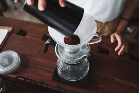 Hand drip coffee , Barista pouring water on coffee ground with filter