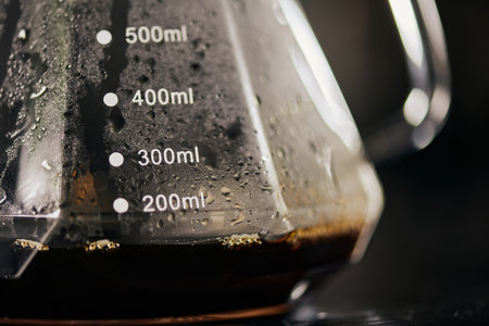 fresh espresso dripping in glass coffee pot from paper filter in dripper stand, V-60 style method
