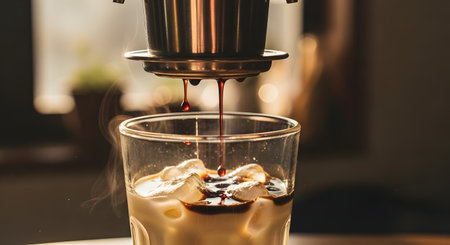Close-up of traditional Vietnamese coffee dripping from a metal phin filter into a glass containing condensed milk and ice cubes. The rich dark coffee creates a beautiful contrast with the sweet white milk layer at the bottom.