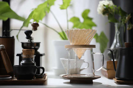 Drip brewing; clear glass of coffee mug and paper dripping bag with ground coffee in soft sunlight at home.