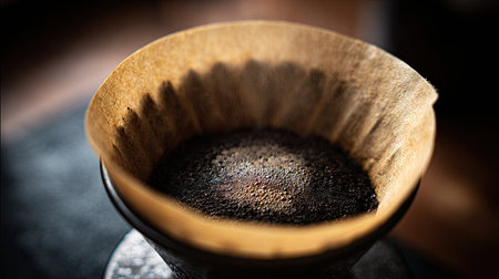 A detailed close-up of a coffee filter filled with grounds, showcasing the brewing process. The warm tones and textures evoke a cozy morning ritual.