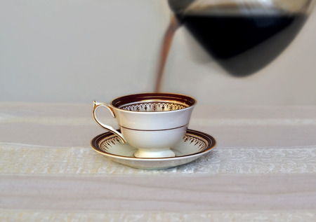 Coffee is being poured into a white cup, creating a rich, aromatic liquid. The warm light adds a cozy atmosphere, perfect for starting the day.