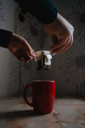 takes out the filter bag with coffee, side view, alternative coffee brewing
