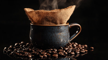 Coffee bag steeping in a cup with rich dark liquid, isolated on black background with gentle light and reflection