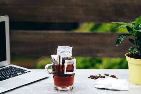 A cup of coffee on the table on the terrace, next to laptop, empty drip coffee bags and arabica coffee beans and coffee arabica plant in pot