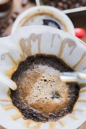 Traditional drip coffee, using white cotton to put coffee and a glass jug for falling hot coffee. Traditional drip coffee of native people in the coffee shop of the village.