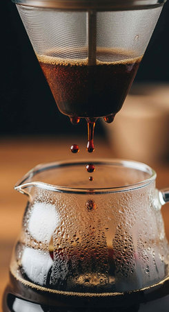 Coffee drip brewing, close-up on the drip filter and cup, morning routine, warm and comforting ambiance