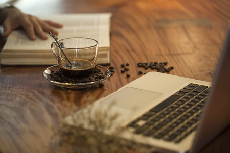 A cup of hot dark chocolate on wooden table with laptop. Drink for hot drink break after working or weekend meeting. Office desk table